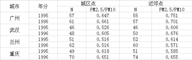 表1-1-3列出了廣州、武漢、蘭州、重慶市兩年的環(huán)境監(jiān)測(cè)顆粒物監(jiān)測(cè)的結(jié)果。由表可見PM2.5與PM10的比值約為0.50~0.75,干旱地區(qū)的蘭州市,PM2.5與PM10的比例較低;環(huán)境監(jiān)測(cè)同時(shí)還可看出郊區(qū)的顆粒物PM2.5與PM10的比值較同一城市區(qū)高,這是因?yàn)镻M2.5可以長(zhǎng)期漂浮在空氣中,并且可以遠(yuǎn)距離輸送。