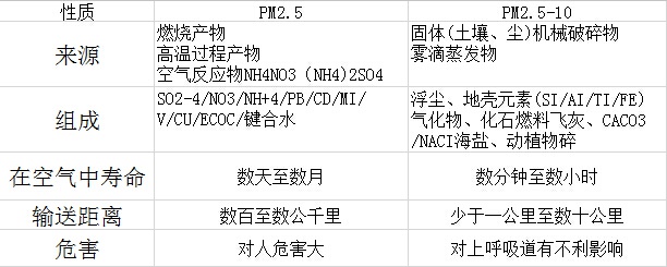 表1-1-4列出了環(huán)境監(jiān)測(cè)環(huán)境空氣中PM2.5、PM2.5-10的來源、組成,在空氣中存在壽命及輸送距離的比較。由表可見PM2.5主要來自人為污染,在空氣中停留時(shí)間長(zhǎng)達(dá)數(shù)天至數(shù)月,可輸送到輸百千里公里之外,難與從空氣中清除。