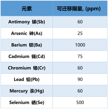 ASTM F963的第4.3.5節(jié)要求,可被兒童吮吸,舔舐,吞咽的涂層和可觸及的基材必須符合八種元素的溶解度限制(限值如下表所示),這八種元素被稱為“ASTM F963元素”。