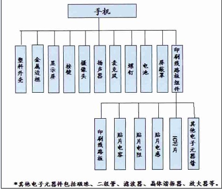 一部手機往往包括數(shù)千個均質(zhì)材料,圖1所示的是手機的基本組成情況。構(gòu)成手機最主要的零部件有:塑料外殼、金屬邊框、顯示屏、按鍵、攝像頭、揚聲器、麥克風(fēng)、電池、屏蔽罩、印刷線路板組件等。印刷線路板組件又包括印刷線路板以及上面的錫鉛焊料、貼片電阻、貼片電容、貼片電感、I C芯片以及其他元器件。在這些基本組成中,有些零部件會因為需要實現(xiàn)一些特定性能而使用有害物質(zhì)。