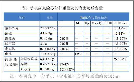 根據(jù)有害物質(zhì)的分布,通過實驗研究總結(jié)了20部手機產(chǎn)品中高風(fēng)險零部件RoHS有害物質(zhì)的分布情況,手機零部件重量及有害物質(zhì)含量見表2。通常手機的塑料外殼和按鍵都由ABS材料制作,里面可能添加8-BDE作為阻燃劑。而攝像頭、揚聲器、麥克風(fēng)等部件的塑料部位以及電線外皮一般由ABS和PVC材料制作,所以可能含有PBDEs和鉛。而錫鉛焊料則是手機中最大的鉛來源。用來制作印刷線路板的基材一般是環(huán)氧樹脂,所以也可能含有PBDEs。