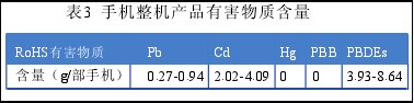 將表2列出的手機高風(fēng)險零部件的重量與其中RoHS有害物質(zhì)的濃度分別相乘匯總后可以得到整機產(chǎn)品的有害物質(zhì)含量,其計算結(jié)果見表3。