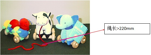 220mm;繩圈周長不能大于 380mm ;玩具如有自回縮繩,在標(biāo)準(zhǔn)測試條件下回縮長度不超過6mm。繩線危害為造成兒童勒死。